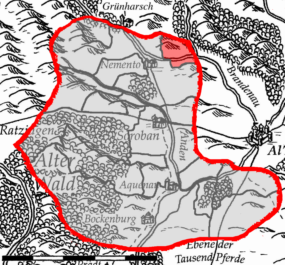 Das Caballerogut Dos Puentes (rot) in der Baronie Nemento (grau).