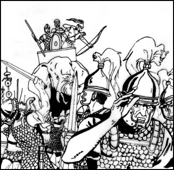 In überstürzter Hast entsandte er ein Heer aus 52 abgerichteten Kriegselefanten, seinen gefürchteten Kamelreitern und hunderten von Fußsoldaten ins Land der untergehenden Sonne.