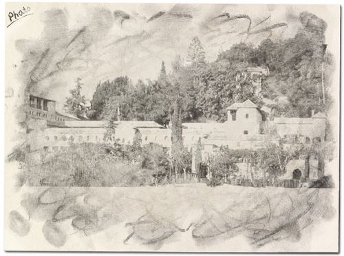 Im über die Jahrhunderte gewachsenen, üppigen Grün zahlreicher Akazien, Pinien, Zypressen, Bosparanien und sonstigen Pflanzenwerks mehr zu erahnen als zu erkennen, befindet sich das im tulamidischen Stil gehaltene Hauptgebäude: zwei außen weiß getünchte, innen säulen- und balustradengeschmückte Stockwerke mit einem flachen Dach aus roten Ziegeln, errichtet um einen geräumigen, zentralen Innenhof.