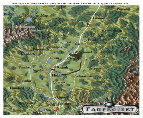 Wer das Junkergut Aranjuez sucht, der wird vom kundigen Ragatier in die Mark Ragathsquell verwiesen, deren nordöstliche Ecke es bildet. Durchschnitten von der bei Wilsemund von der Reichsstraße II abzweigenden Straße gen Valenca grenzt es im Norden an die Baronie Valpokrug und im Osten an die Baronie Falado, wo sich der nordöstliche Zipfel an deren westlichen Wald schmiegt. Im Süden verläuft die Grenze teilweise entlang des Harmamunder Forstes.