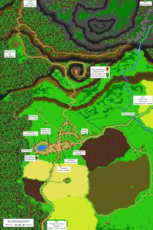 Der Markt Kornhammer, gelegen am Fuß der Raschtulswall-Vorberge, ist die größte und außerhalb ihrer Grenzen meist einzige bekannte Ortschaft der Baronie Königlich Kornhammer.