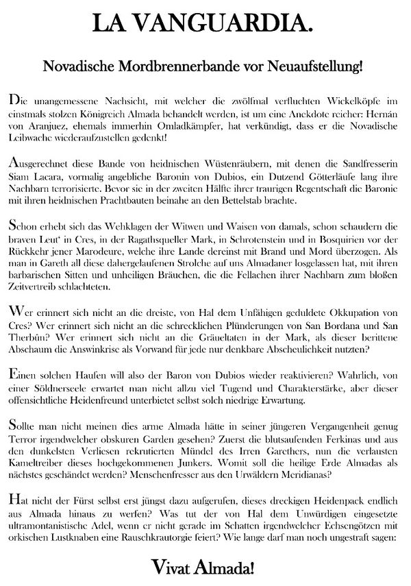 Dieses im Ingerimm 1036 BF insbesondere in Punin, Ragath und Taladur kursierende Flugblatt von La Vanguardia. thematisiert die Entscheidung des Dubianer Barons Hernán von Aranjuez die Novadische Leibwache wiederaufzustellen.