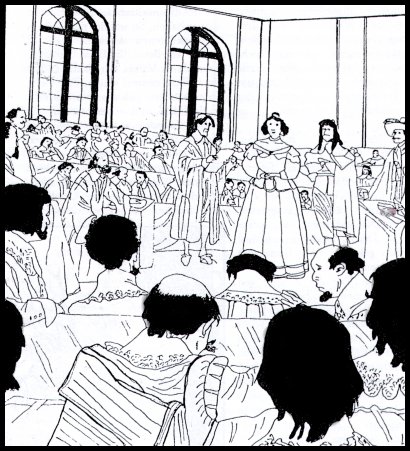 Die Stände sitzen einander in der Landständeversammlung, die meist in Punin im Großen Saal der Hofkanzlei oder im Königssaal[1] der Residencia stattfindet, in althergebrachter, für Auswärtige obskur anmutender Tradition, auf fünfeinhalb Bänken im Sechseck gegenüber. Fünfeinhalb Bänke deshalb, da neben den Adligen der Grafschaften Ragath, Waldwacht, Yaquirtal und Südpforte auch die der heidnisch besetzten Reichsmark Amhallas und die der geteilten (und zwischen Almada und Garetien halbierten) Landgrafschaft Caldaia eine eigene Edlenbank besetzen.