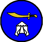 Auf blauem Grund ein goldener Krummsäbel über einem silbernen Zelt