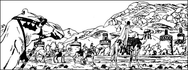 Quer durch Transbosquirien verläuft der berüchtigte Blutpass, der Almada mit dem Erkin und der befreundeten Metropole Fasar verbindet. Zweimal im Jahr - im Frühjahr und im Herbst - zieht die große Tuch- und Gewürzkarawane von Punin nach Fasar und vice versa - geschützt von einem Banner der Tulamidischen Reitern und mit ihrer kostbaren Handelsware das begehrteste Ziel für alle Gesetzlosen und Wegelagerer entlang des Weges.