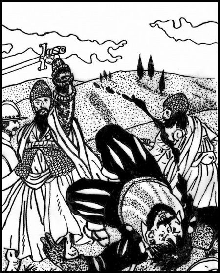 Das Schlachtenglück neigte sich immer weiter den Caldaiern zu, und als deren größter Held, der Recke Unicorno von Khahirios, den Ragather Connetabel Almanzor von Dubios erschlug, rieten die verbliebenen Hauptleute und Barone ihrer Gräfin, zum sofortigen Rückzug blasen zu lassen. Diese aber wollte davon nichts wissen, sie focht weiter, bis sie und ihre letzten Getreuen fast umzingelt waren, als sie auf einmal einen von den Kämpfen aufgeschreckten Hammel durch ein schmales, Dornicht-verdecktes Nadelöhr aus dem Hügeltal heraus fliehen sah. "Dort hinaus! Dem Hammel nach!", gellte ihr letzter Befehl über das Schlachtfeld und so entkamen die Gräfin und der Rest ihres Aufgebots durch das Schlupfloch des schlauen Tieres.